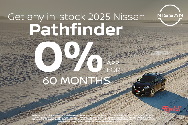 Available on 2025 Pathfinder (Trims: all) from new Dealer stock. 0.0% APR financing for 60 months (e.g. $16.67 per month per $1,000 financed at 0.0% for 60 months). Actual down payment may vary. Subject to residency restrictions. Subject to NMAC credit approval. Not all buyers qualify. Dealer contribution may affect actual price set by Dealer. Vehicle shown may not represent actual vehicle advertised. Contact Dealer for details. APR Offer Ends 03/02/2026.