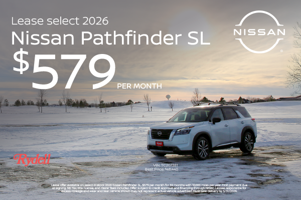 Lease offer available on select in stock 2026 Nissan Pathfinder SL. $579 per month for 39 months with 10,000 miles per year. First payment due at signing. ND Tax, title, license, and dealer fees included. Offer subject to credit approval and financing through NMAC. Lessee responsible for excess mileage and wear and tear. Vehicle shown may not represent actual vehicle advertised. Must take delivery by 3/31/2026.